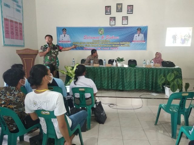 Babinsa Koramil 0201-06/MS Sertu A.Manihuruk, Badan Narkotika Nasional (BNN) Provinsi Sumatera Utara Ibu Nurfadhilah, S.Psi. dan Kanit Binmas Polsek Medan Helvetia Iptu Suparmin memberikan pelatihan dan pembekalan tentang Pencegahan Pemberantasan Penyalahgunaan dan Peredaran Gelap Narkoba (P4GN) kepada masyarakat dan pelajar di Aula Kantor Kel.Cinta Damai JL. Mesjid No.48 Kec.Medan Helvetia Jumat, (03/06/2022).