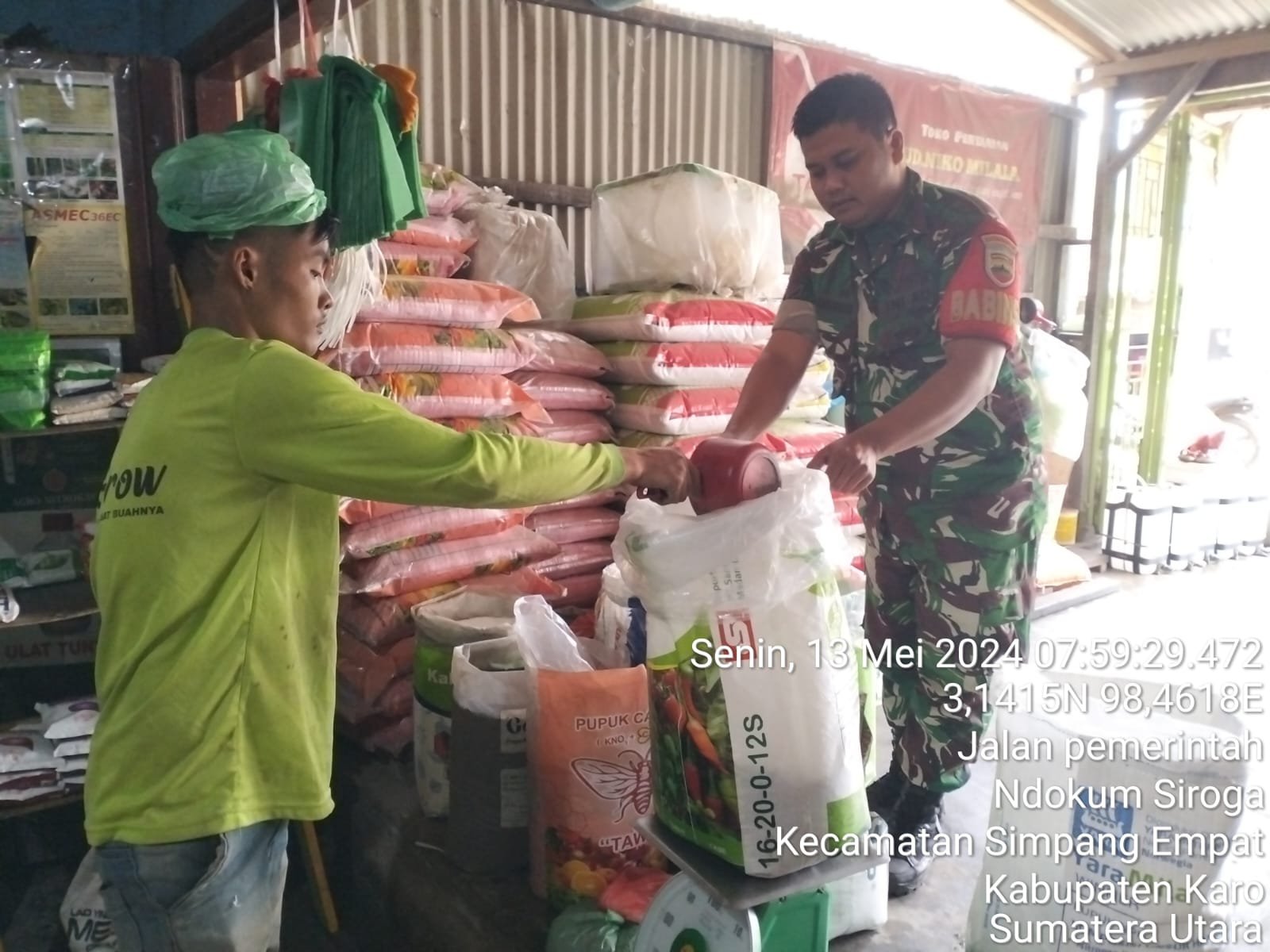 Tanah Karo. Senin 13/05/2024. Babinsa jajaran TNI AD melaksanakan kegiatan pengecekan harga dan ketersediaan stok pupuk serta obat pertanian maupaun bibit unggul tanaman secara rutin adalah bagian dari kegiatan pendampingan dan pengawalan Upaya Khusus Program Ketahanan Pangan Nasional, hal tersebut dilakukan dengan pengecekan distribusinya melalui Grosir, Toko Pertanian hingga ke kios-kios yang ada di wilayah binaannya.