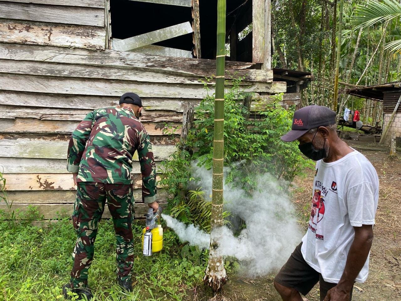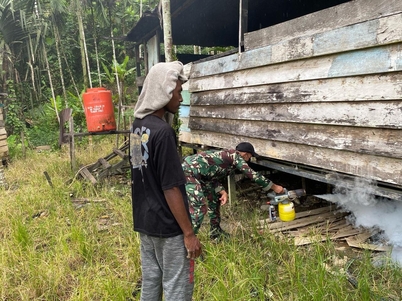 Basmi Malaria, Satgas Yonif 131/Brajasakti Lakukan Fogging di Kampung Ampas Perbatasan Papua.