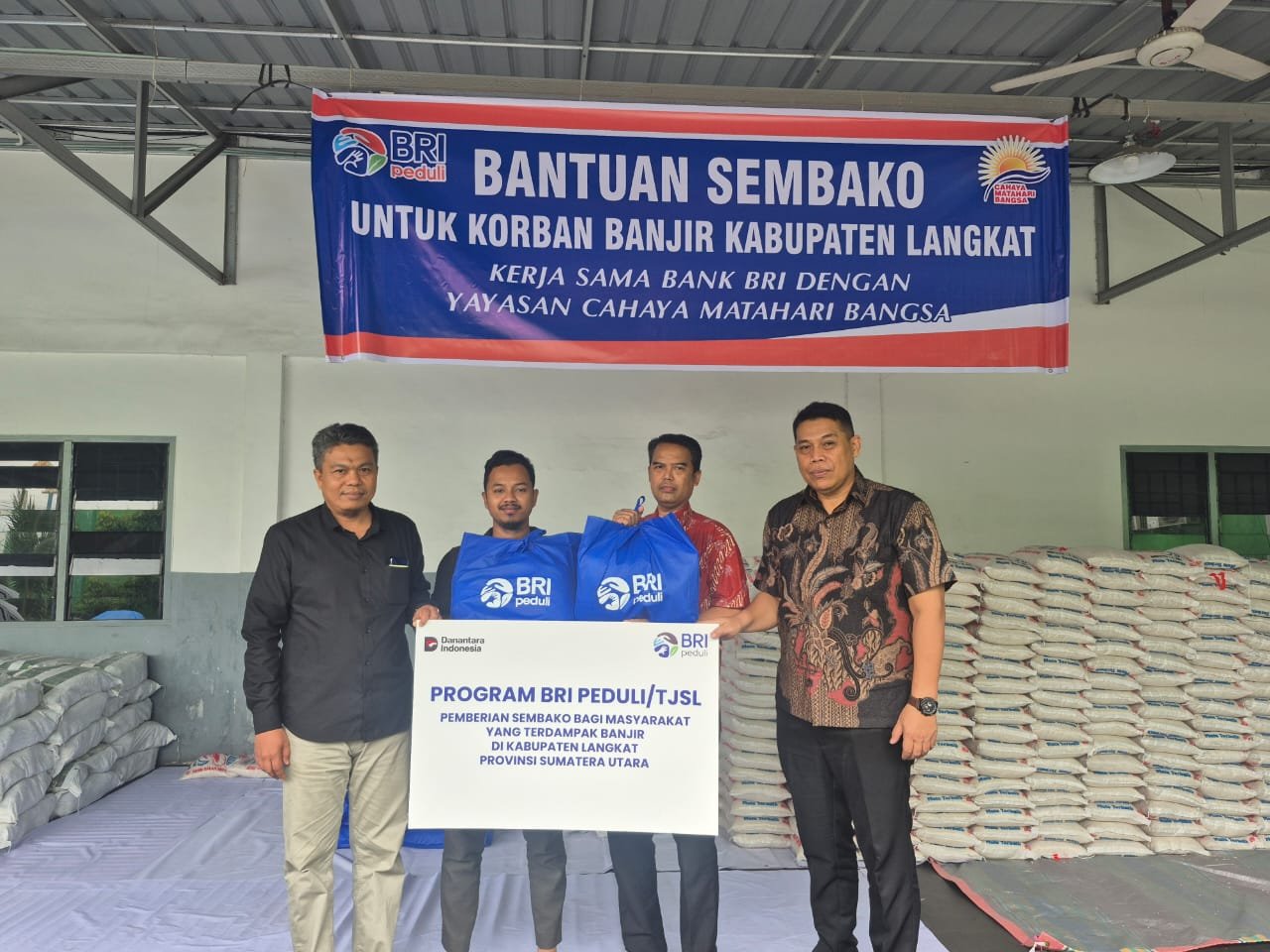 Medan – PT Bank Rakyat Indonesia Kantor Cabang Medan Thamrin menyerahkan bantuan paket sembako secara simbolis kepada Yayasan Cahaya Matahari Bangsa. Penyerahan ini merupakan bagian dari Program BRI Peduli Corporate Social Responsibility (CSR) yang difokuskan pada paket sembako bagi masyarakat terdampak banjir di Kabupaten Langkat, Provinsi Sumatera Utara.