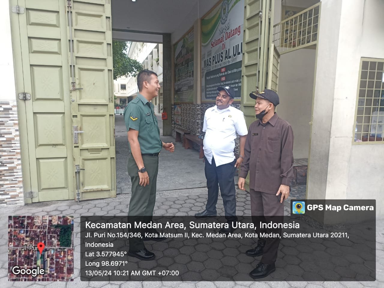 Medan Area – Upaya meningkatkan kenyamanan di lingkungan sekolah, Serda AF Sitompul Babinsa Kotamatsum II, Koramil 0201-04/MK melaksanakan Komsos dengan penjaga keamanan/security sekolah membahas keamanan lingkungan sekolah, Selasa (13/05/2024).