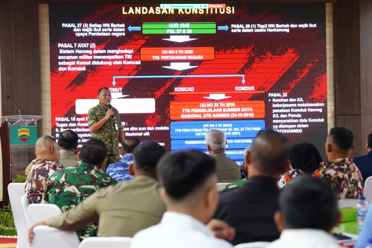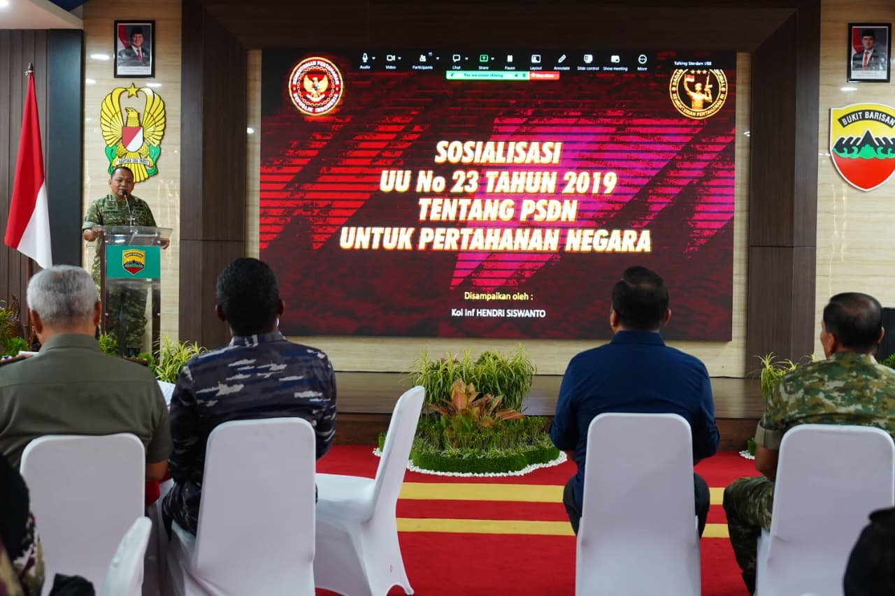 Kolonel Kes Samsiruddin Samosir, S.Pd., M.Pd yang membacakan sambutan Kabacadnas Letjen TNI Gabriel Lema menyampaikan bahwa sosialisasi ini bertujuan memberikan pemahaman terhadap substansi UU Nomor 23 Tahun 2019, mulai dari pembinaan kesadaran bela negara, penataan komponen pendukung, pembentukan komponen cadangan, hingga mobilisasi dan demobilisasi. Ia menegaskan bela negara harus diaktualisasikan dalam setiap profesi melalui kerja keras, pengabdian, dan semangat nasionalisme berlandaskan Pancasila.