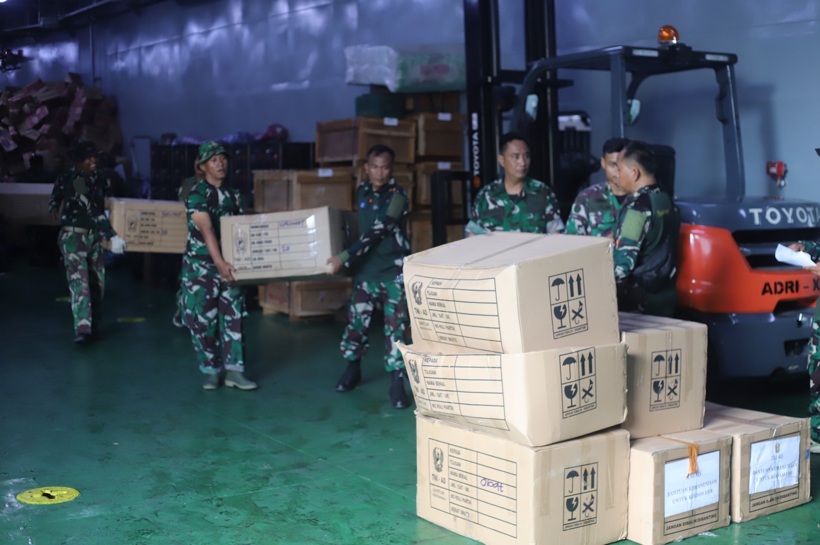 Beragam bantuan dikirim untuk mendukung kebutuhan para korban bencana. Dari Mabesad, bantuan yang dibawa antara lain alkapkes, aldurlap, beras, mie instan serta matras.