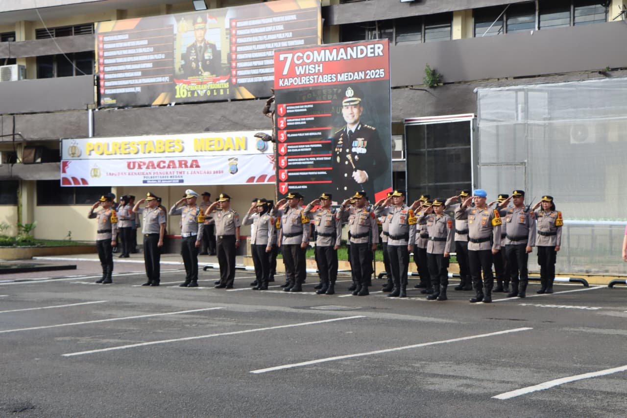 Medan — Polrestabes Medan menggelar upacara Korps Raport Kenaikan Pangkat bagi 130 personel Polri pada Jumat, 2 Januari 2026. Kegiatan tersebut dilaksanakan di Mapolrestabes Medan dan dipimpin langsung oleh Kapolrestabes Medan Kombes Pol. Dr. Jean Calvijn Simanjuntak, S.I.K., M.H.