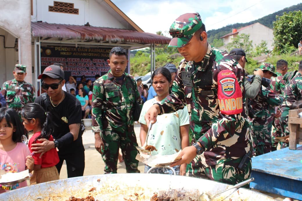 Tapanuli Utara – Satgas Gulbencal Kodam I/Bukit Barisan bersama tim Chef Bobon Santoso menggelar kegiatan masak besar bagi warga terdampak bencana di Desa Adiankoting, Kecamatan Adiankoting, Selasa (09/12/2025). Kegiatan yang dipusatkan di kompleks Gereja HKBP Adiankoting ini menjadi bentuk nyata kepedulian sosial sekaligus dukungan bagi masyarakat yang sedang menjalani masa pemulihan pascabencana.