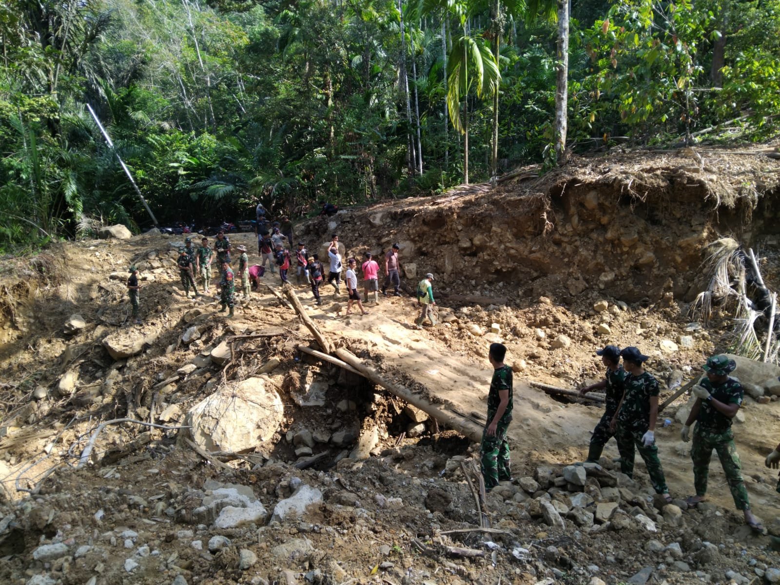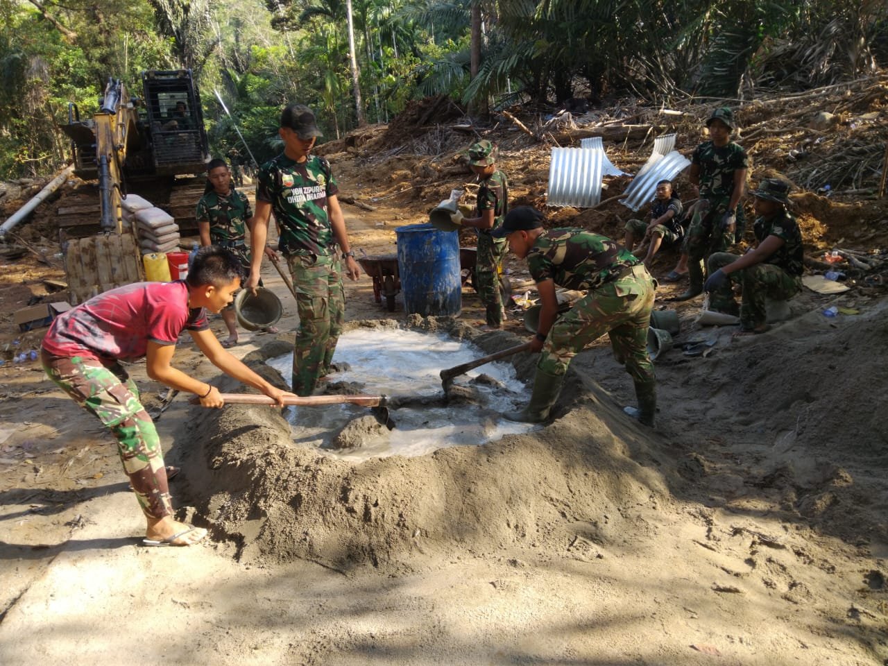 Kegiatan pembangunan melibatkan personel Koramil 04/Pinangsori, Denzibang 4/1 Sibolga, serta Yon TP 908/Gaja Dompak yang bekerja bersama di lapangan untuk memastikan pekerjaan berjalan aman dan sesuai rencana.