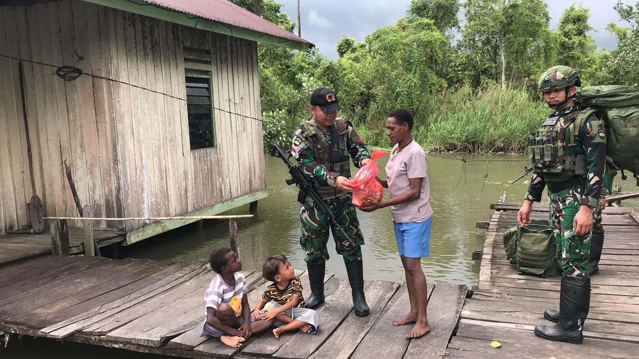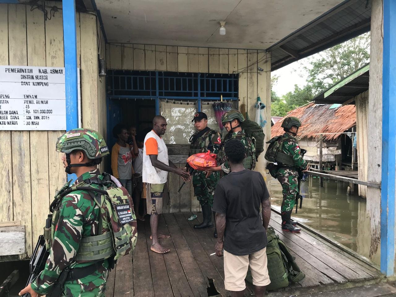 Dalam sebuah aksi peduli kemanusiaan, Pos Suator Satgas Yonif 123/Rajawali melaksanakan pembagian sembako di Kampung Emnam, Distrik Suator, Kabupaten Asmat. Kegiatan ini bertujuan membantu masyarakat yang terdampak banjir yang sudah lebih dari 5 bulan belum surut.Jumat,(03/10/2025).