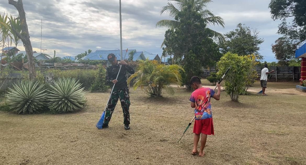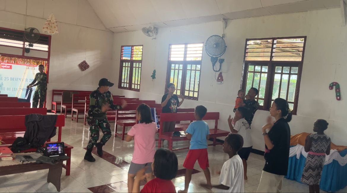Personel Satgas bersama warga bergotong-royong membersihkan area gereja, menata kursi, serta menyiapkan ornamen-ornamen Natal. Kegiatan berlangsung penuh kekeluargaan dan mencerminkan harmonisasi antara TNI dan masyarakat di perbatasan.