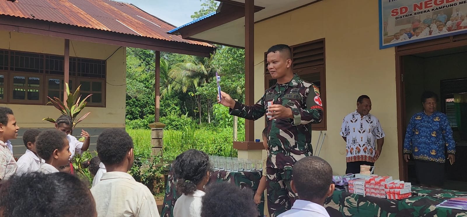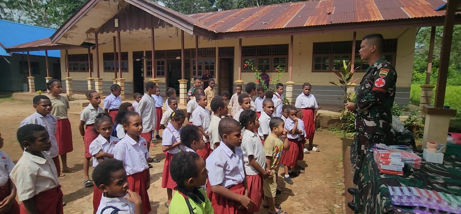 ‎Bade, Papua (13/02/2026) – Semangat kebaikan menyala di Distrik Edera, Kabupaten Mappi, Para prajurit Satgas Pengamanan Perbatasan (Pamtas) Kewilayahan Yonif 123/Rajawali, khususnya yang bertugas di Pos Bade, tak hanya menjaga keamanan, tapi juga merawat kesehatan generasi penerus bangsa.