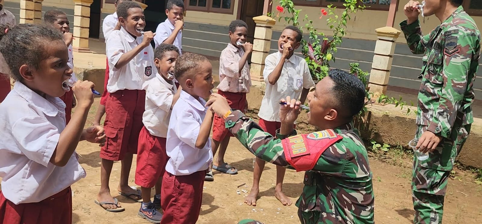 ‎Satgas Yonif 123/Rajawali Lewat Pos Bade, Ajarkan Anak-anak SD di Mememu Cara Sikat Gigi yang Benar untuk Hidup Sehat!