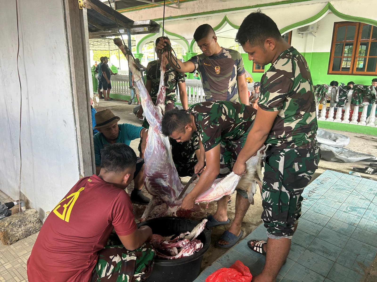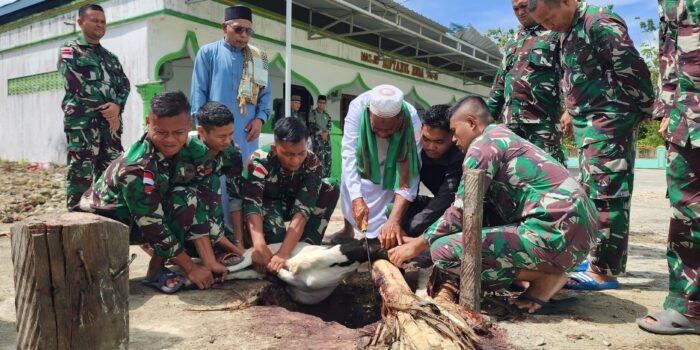 Kegiatan yang dipusatkan di Masjid Miftahul Huda ini diawali dengan pelaksanaan Sholat Idul Adha yang diikuti oleh personel Satgas dan warga setempat. Usai Sholat, dilanjutkan dengan pemotongan hewan kurban berupa satu ekor sapi dan beberapa ekor kambing yang disiapkan oleh Satgas sebagai bentuk kepedulian dan rasa syukur.