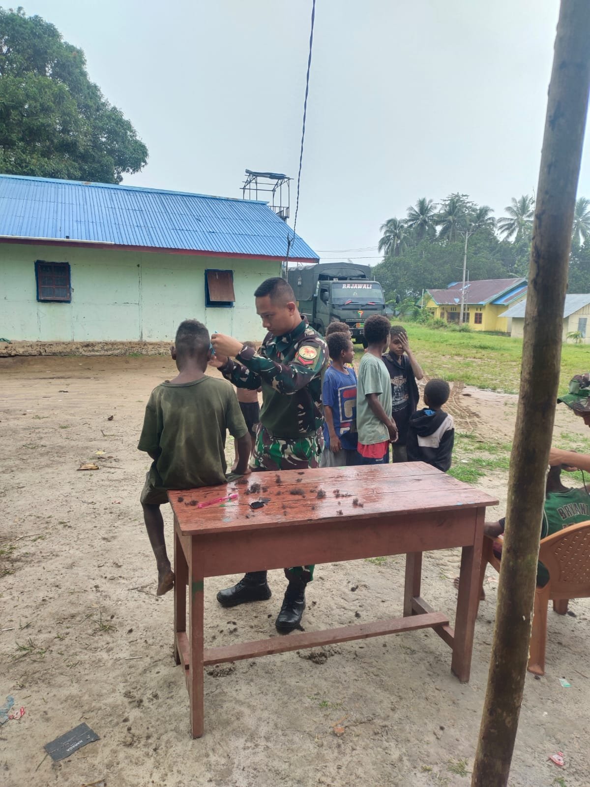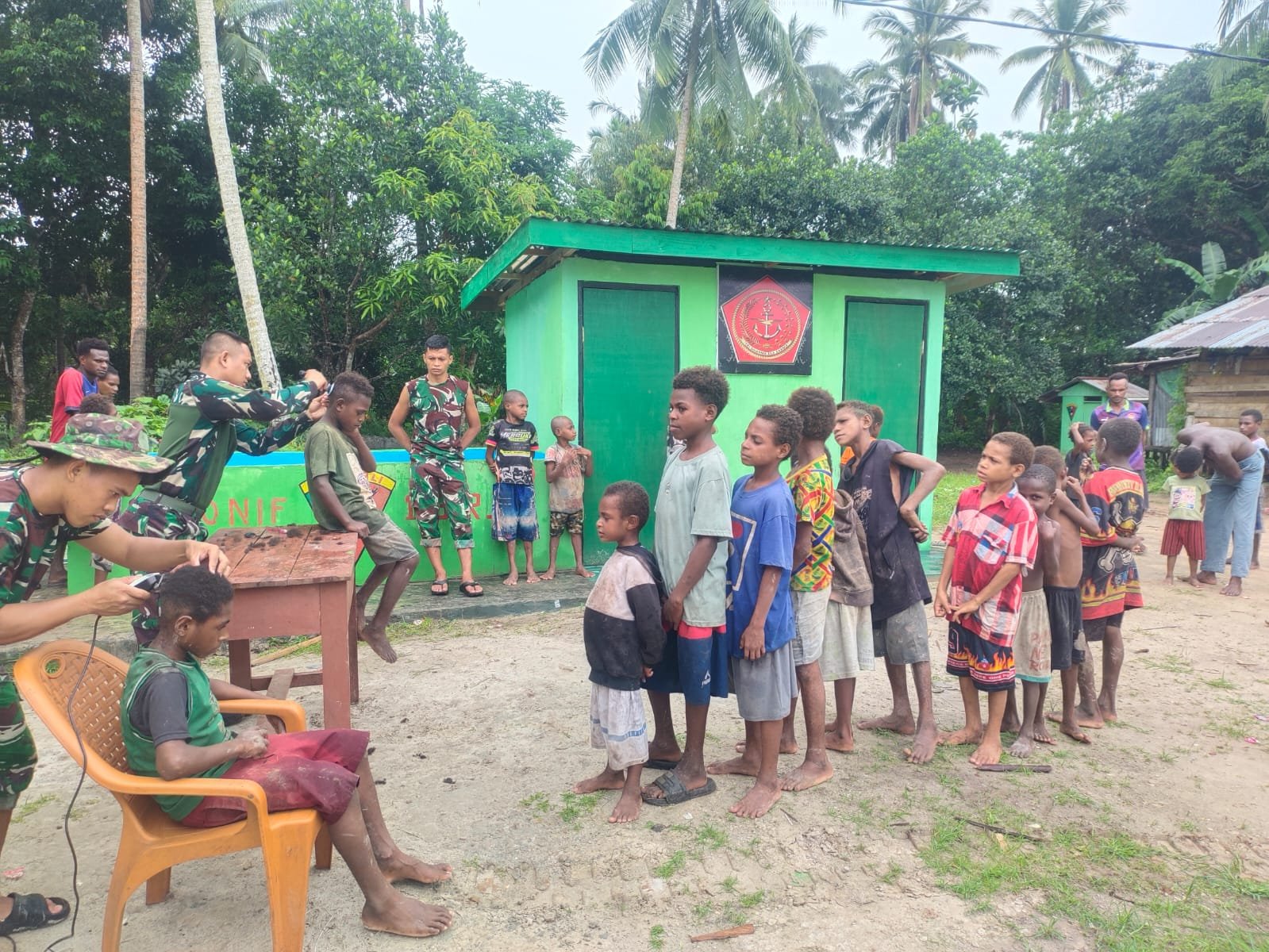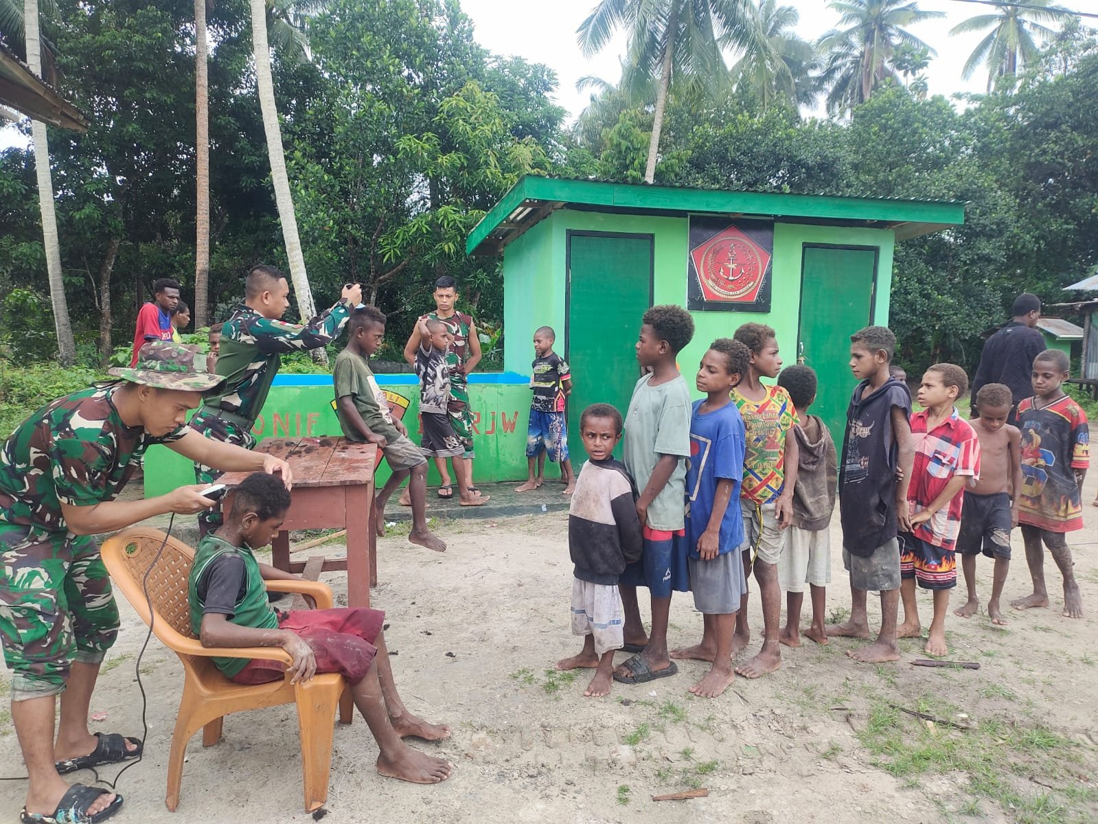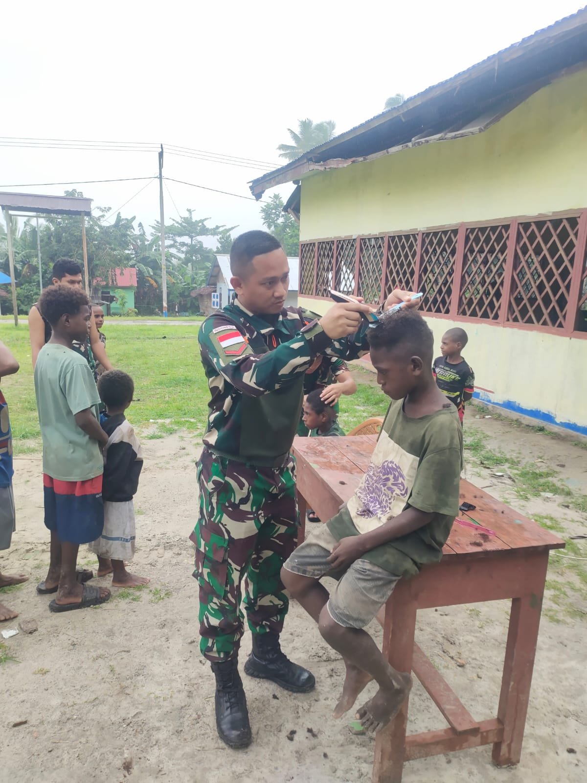 Dalam suasana penuh kehangatan dan keceriaan, para prajurit TNI dari Satgas Yonif 123/Rajawali melaksanakan kegiatan sosial dengan memangkas rambut anak-anak di kampung binaan. Kegiatan sederhana ini disambut antusias oleh anak-anak yang tampak bahagia dan bersemangat saat mendapatkan potongan rambut baru dari para prajurit.