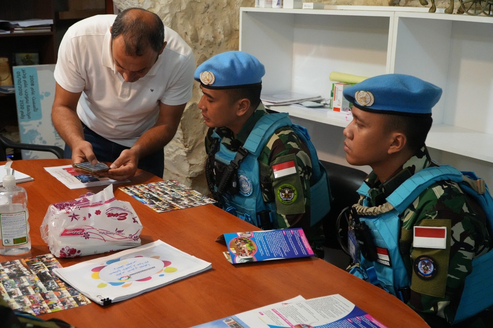 Rombongan Staf CIMIC Satgas Yonmek TNI Konga XXIII-R UNIFIL Lettu Mar Akmal dan Lettu Chk Danang beserta beberapa anggota Tim Eangagement yang dipimpin Dantonnya Letda Adm Ayub .S Tarigan mendatangi kantor NGO Al Moustamaa dan disambut dengan ramah oleh Mr. Wael Ismail yang kemudian menjelaskan tentang kegiatan-kegiatan sosial yang dilaksanakan oleh organisasinya tersebut.