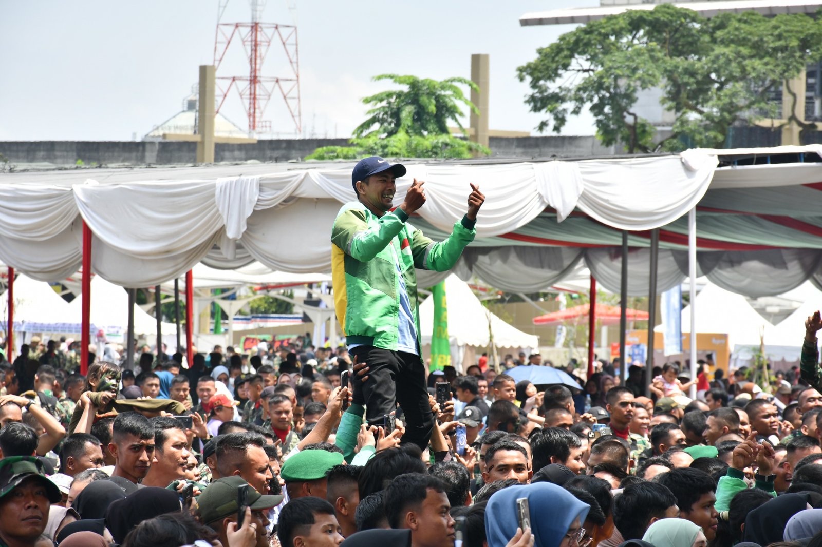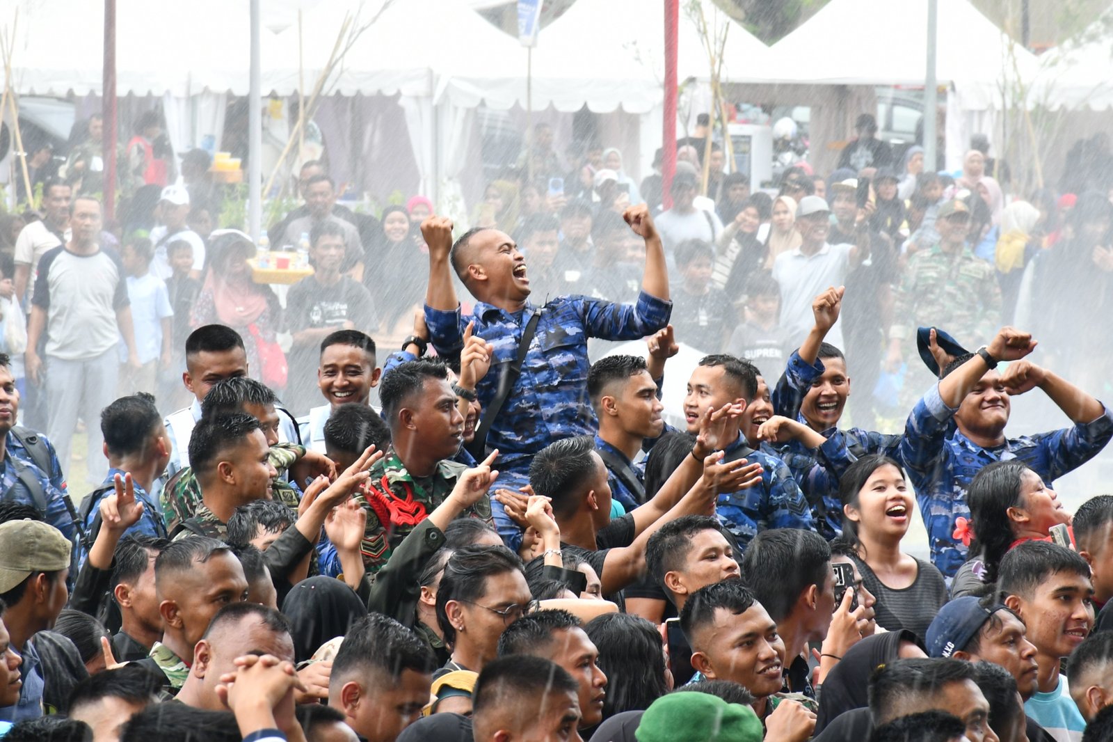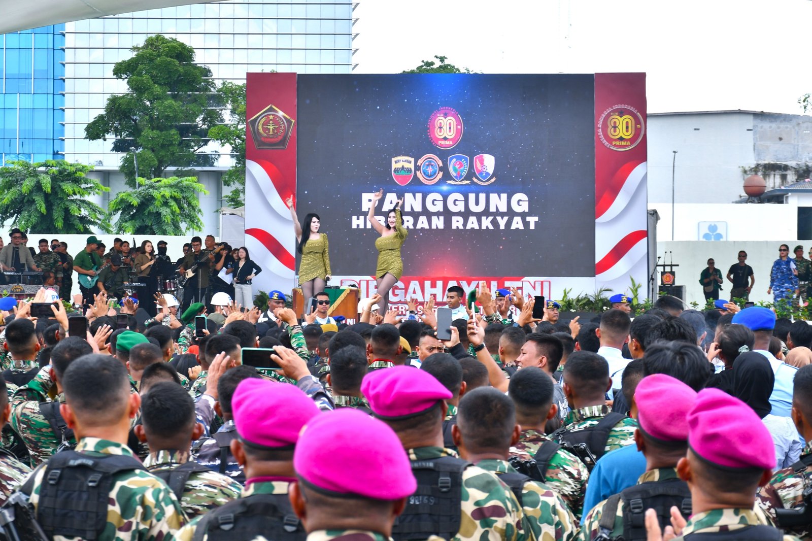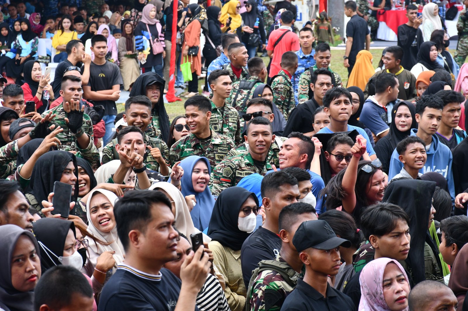Tak kalah heboh, Duo Serigala lebih dulu mengguncang panggung dengan lagu-lagu dangdut koplo yang membuat suasana makin riuh. Sejumlah prajurit dan warga ikut berjoget bersama di area lapangan, menciptakan momen kebersamaan yang akrab dan penuh tawa.