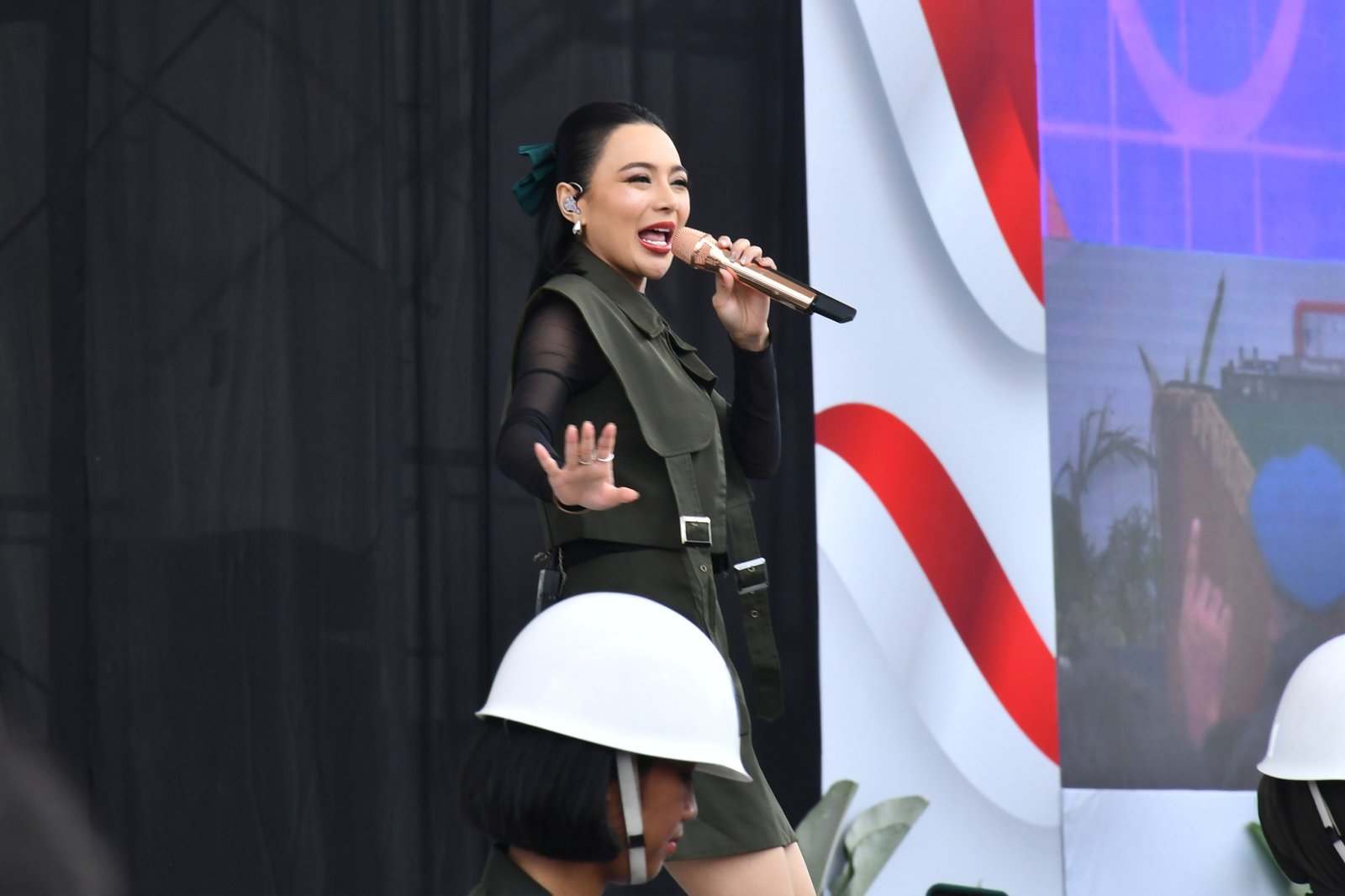 Wika Salim tampil energik dengan balutan busana hijau bergaya militer. Ia menyapa prajurit dengan hangat dan mengajak mereka bernyanyi bersama. Tawa pecah di antara penonton saat salah satu prajurit naik ke panggung dan berduet spontan dengannya.