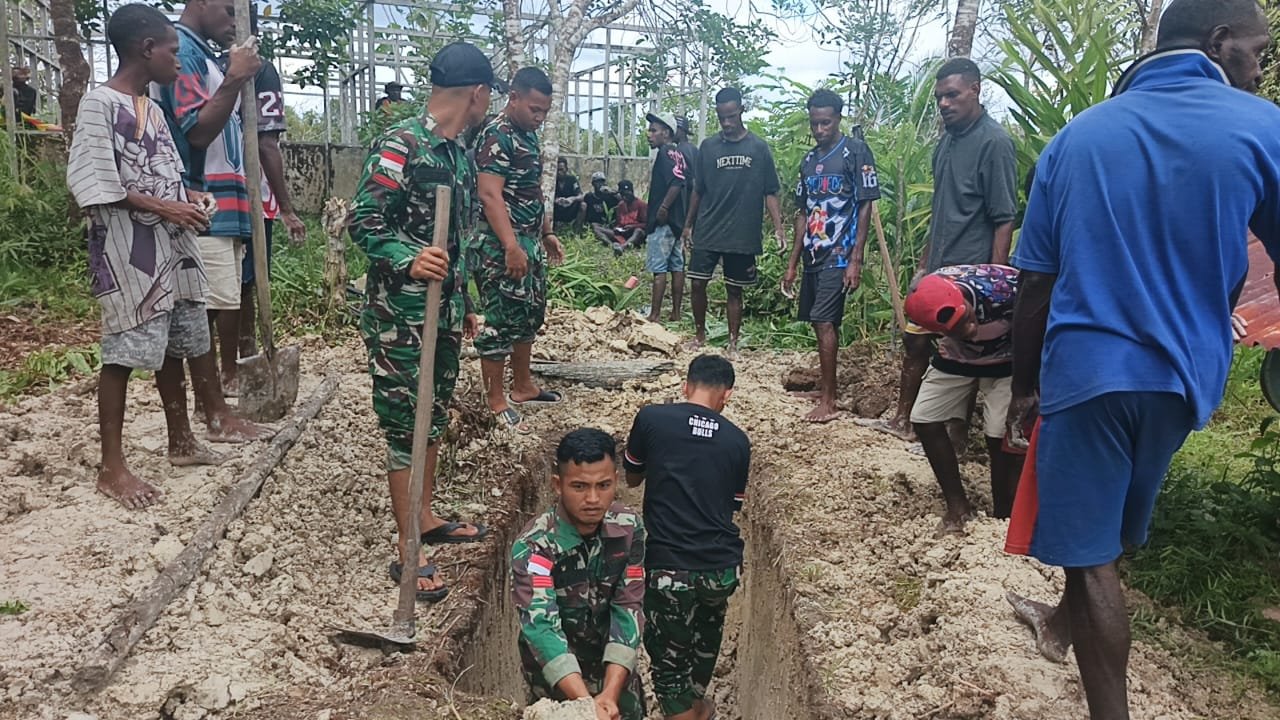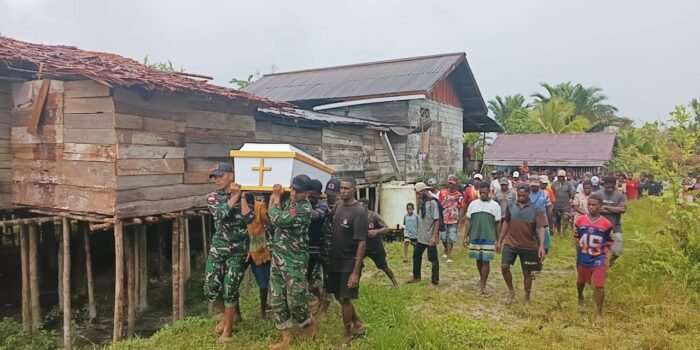 Kaibar, Papua Selatan — Pos Kaibar Satgas Yonif 123/Rajawali menunjukkan kepedulian dan kedekatan dengan masyarakat pedalaman Papua dengan turut membantu prosesi pemakaman salah satu warga Kampung Amazu, Distrik Kaibar, Kabupaten Mappi, Papua Selatan, pada Selasa (06/01/2026).