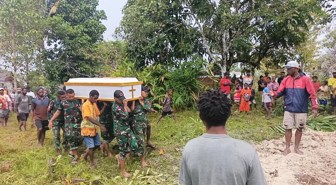 Wujud Kepedulian, Pos Kaibar Satgas Yonif 123/Rajawali Hadiri Pemakaman Warga Kampung Amazu